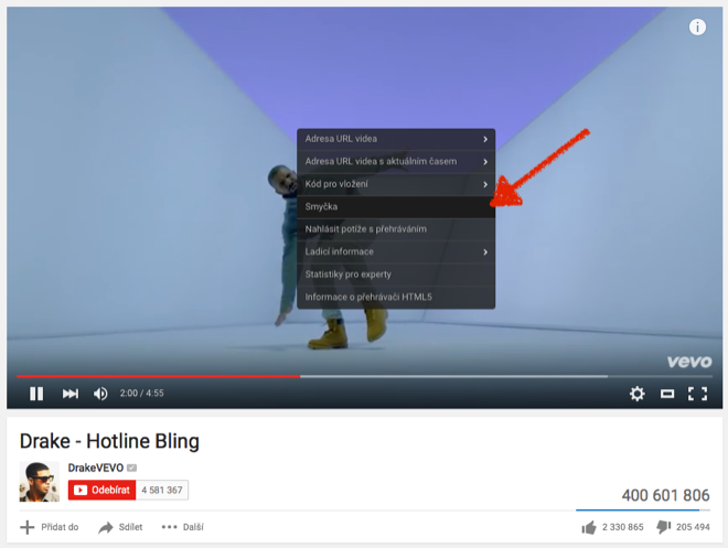 Aktivovat smyčku je navíc velice jednoduché. Stačí spustit video, kliknout do něj pravým tlačítkem myši a z menu zvolit Smyčka, jako to můžete vidět na snímku obrazovky níže. Jakmile video skončí, okamžitě se automaticky pustí zase od začátku a vy se tak nemusíte vůbec o nic starat.