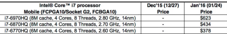 Intel tento týden tiše vydal nový ceník čipů, který taktéž obsahuje několik nových procesorů řady Skylake, které by mohly být použity v aktualizovaném 15palcovém MacBooku Pro s Retinou. V MacBooku Pro by se mohl objevit například nový čtyřjádrový procesor Core i7-6770HQ s taktem 2,6 GHz, Core i7-6870HQ s taktem 2,7 GHz a Core i7-6970HQ s taktem 2,8 GHz. Všechny jmenované stojí stejně jako ty z řady Haswell, které jsou nyní obsaženy v MacBooku Pro.