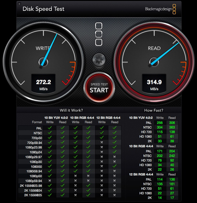 Na měření rychlosti přenosu dat jsem využil aplikaci Black Magic Speed Test. Výsledek testu při připojení přes Thunderbolt vykazoval hodnoty 272,2 MB/s při zápisu a 314,9 MB/s při čtení. Disk jsem testoval i při běžné práci a za celou dobu jsem nezaznamenal jediné přerušení nebo zadrhnutí, plynulost práce s daty byla výborná, ať už při načítání či zapisování.