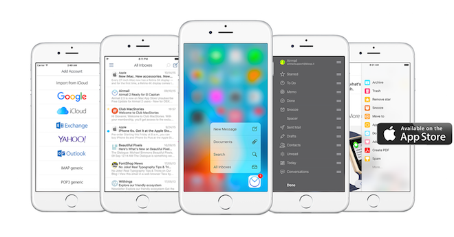 Zaplatíte za ňu síce 4,99€, ale počet funkcií, ktorými sa vyznačuje, odpovedá cene. Okrem toho, že vám bude posielať notifikácie, tak podporuje štítky a umožní vám vytvárať PDF dokumenty na cestách. Ponúka tiež integráciu 1Password a na ukladanie súborov z mailu si môžete aplikáciu prepojiť s Dropboxom alebo Google Drive úložiskom, ktoré je tu zahrnuté viacmenej ako doplnok k už existujúcej podpore pre Gmail. Okrem neho však podporuje aj iCloud, Yahoo!, Outlook, Microsoft Exchange a ak by vám to bolo málo, potom si môžete nastaviť aj vlastný IMAP alebo POP3 mail. Aplikácia samozrejme dokazuje, že je rok 2016 a tak podporuje 3D Touch, Apple Watch a taktiež synchronizáciu s verziou pre Mac cez iCloud.