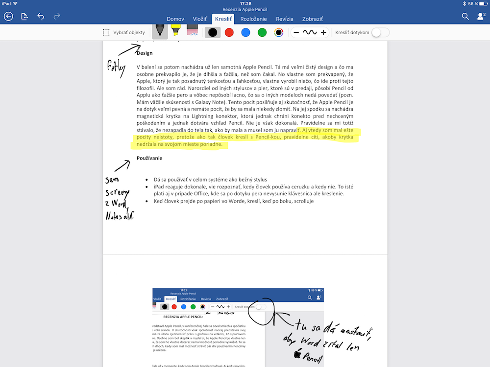 Veľmi spokojný som bol aj pri práci s Office. Pretože mám s iPadom Pro veľmi dobré skúsenosti, značnú časť tejto recenzie som napísal priamo na ňom vo Worde, ktorý reagoval na podnety Pencilky veľmi dobre. Písať pomocou klávesnice na displeji a zároveň pri tom zvýrazňovať sa dá takmer bez zdržania. Jediné, čo musíte spraviť, je ťuknúť na text prstom. Mimochodom, keď už som u toho, tak iPad dokáže pri práci s Pencilkou veľmi dobre ignorovať položenú ruku na displeji, čo pri tak veľkých rozmeroch oceníte. Predsa len, udržiavať ruku dlhodobo nad displejom by nebolo veľmi pohodlné.