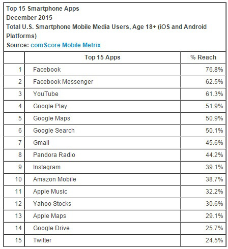 Není divu, že více než 50% aplikací pochází ze dvou společností – Googlu a Facebooku. Nejpopulárnější je Facebook, která má dosah 76,8%, vypadá to ale, že čísla dosahu by mohla klesat. Dnes bylo prokázáno, že aplikace Facebook vám po odinstalování prodlouží výdrž baterie až o 15%. Druhou nejpopulárnější aplikací je Facebook Messenger. Třetí místo bere podle seznamu nejlepší aplikace od Googlu, tou má být YouTube.