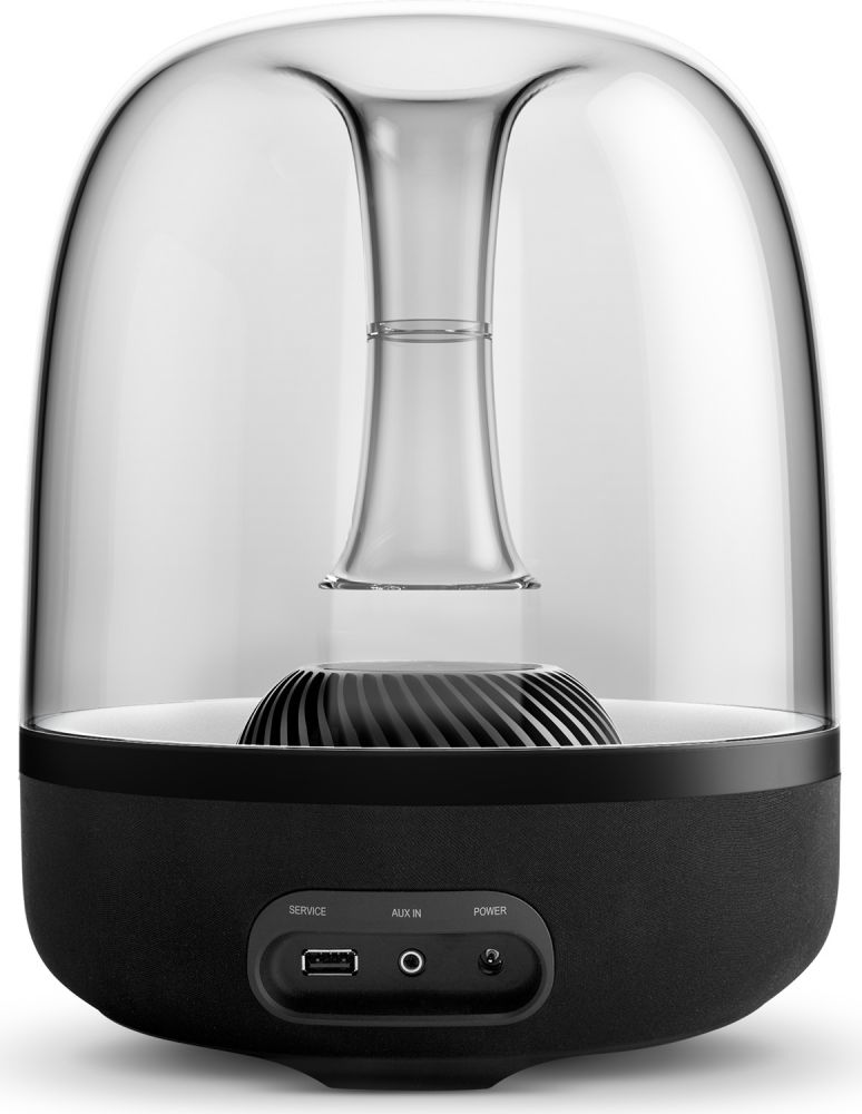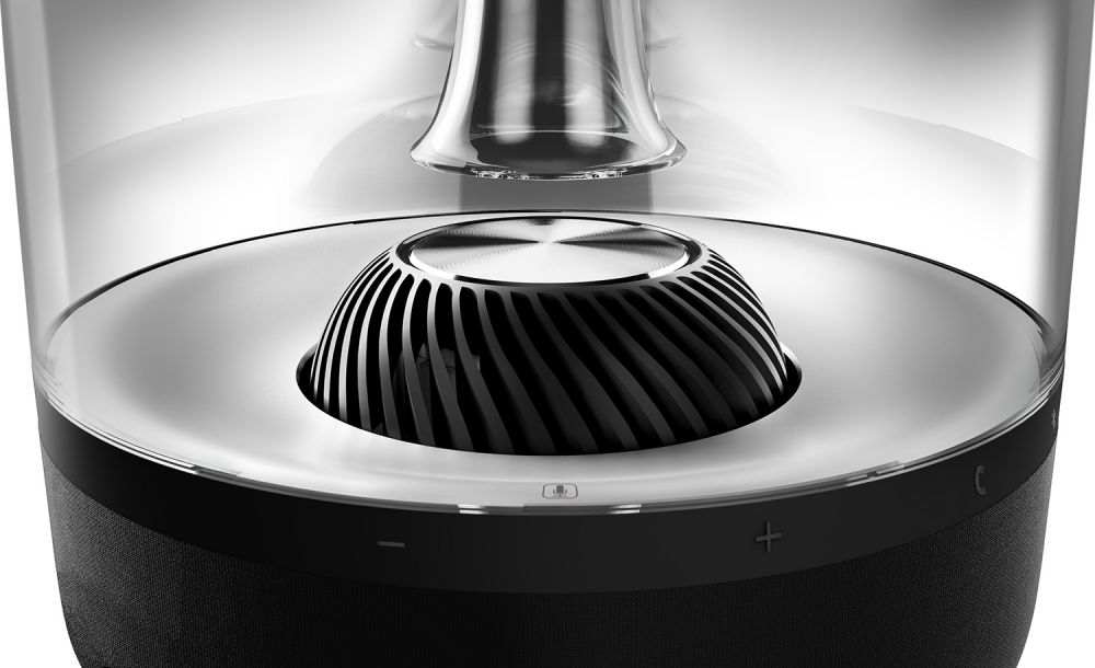 Ďalej nasleduje pohľad na obrovské sklenené teleso, ktoré vstupuje dovnútra reproduktoru. Osobne mi to pripomína kancelársku fontánku. Čo je ale dôležité, je, že toto sklenené teleso slúži zároveň ako zosilovač a hlavne, vďaka otvoru uprostred, ktorý slúži ako výduch. Pretože ide zvuk zvrchu, nemá určený konkrétny smer a dostávame sa tak k najdôležitejšej vlastnosti, ktorou sa Aura líši od iných. Reproduktor bol totiž navrhnutý tak, aby poskytoval rovnako kvalitný zvuk zo všetkých strán. Inak povedané, 360-stupňový zvuk. Osobne ma to veľmi potešilo, keďže na rozdiel od iných reproduktorov som si ho nemusel na seba namieriť, ale len som ho položil tam, kam som chcel. Len som teda musel dávať pozor, aby som pri práci s ním nezavadil o spomínané tlačidlo.