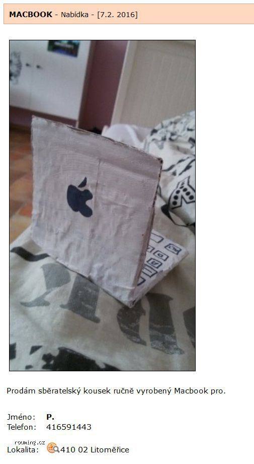 Bazos.cz je zdrojem nejen tisíců inzerátů, ale také vtipálků, kteří zde prodávají nejrůznější nesmysli. Mezi ty patří také model Macbooku, který by mohl nadchnout milovníky moderního umění. Inzerát najdete přímo zde.