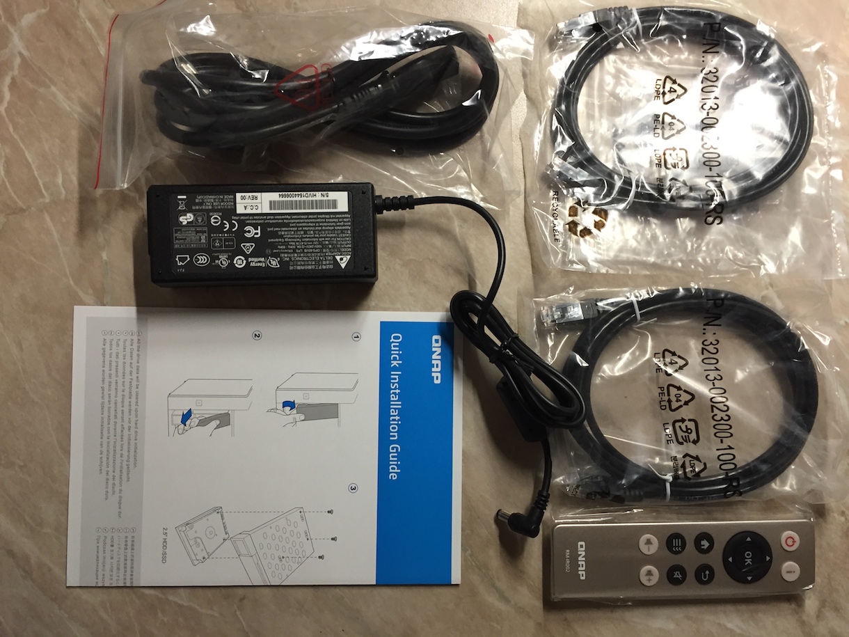NAS server je bezpečne zabalený v kartónovej krabici, v ktorej nájdeme 2x sieťový kábel pre pripojenie serveru k sieti, napájací AC kábel a zdroj, sadu skrutiek na uchytenie diskov (8ks strieborných pre uchytenie 3,5“ diskov a 6ks čiernych pre uchytenie 2,5“ diskov), stručný manuál pre rýchly začiatok a ovládač.