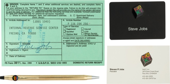 Hodinky a zmíněné pantofle ale nebyly vůbec jediné předměty, které se nyní dostaly do aukce. Přihodit jste mohli například i na klasický černý rolák, který Steve Jobs nosil snad pořád. Tento konkrétní měl na sobě nápis NeXT respektive logo společnosti, kterou Steve Jobs po odchodu z Applu založil. Další aukce zase nabízela NeXT vizitku a jmenovku. Společně s těmi se pak prodávalo i jedinečné, pozlacené Apple Computers pero.