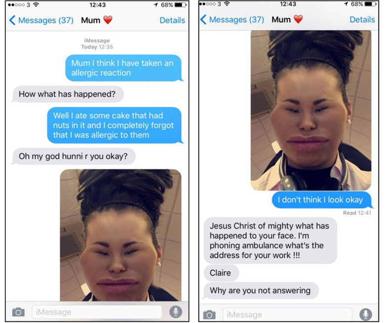 Abychom byli spravedliví, nemůžeme se matce vůbec divit, že dospěla k takovému závěru. Dcera Claire Maughan doprovází snímek popiskem “Myslím, že mám alergickou reakci”. Když se matka zeptala co se stalo, dcera odpoví, že je to pravděpodobně alergie na ořechy, což vedlo matku k reakci “Ježíš Kriste, co se ti to stalo s obličejem?”. Následně chtěla zavolat dceři sanitku do práce. Bohužel nevíme jak tenhle prank dopadl.