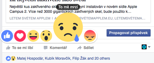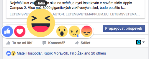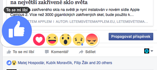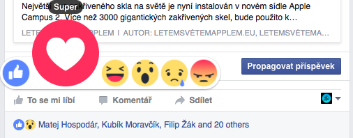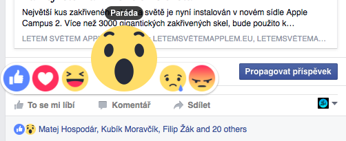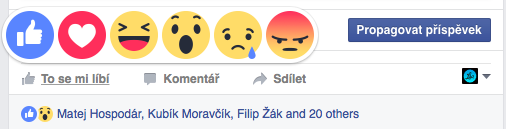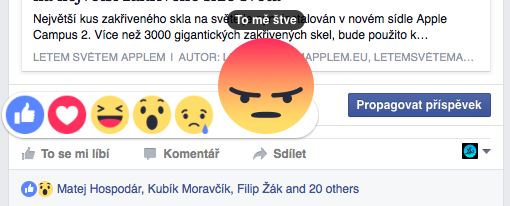 Facebook právě na svém blogu oznámil, že dnes globálně všem uživatelům zpřístupní nové tlačítko „To se mi líbí.“ Facebook nepřidal jen jedno tlačítko vedle toho současného, ale obohatil jej o možnost vyjádření jakýchsi pocitů respektive reakcí. Najdete zde tedy tradiční „To se mi líbí“, poté „Super“, „Haha“, „Paráda“, „To mě mrzí“ a „To mě štve.“ Všechny zmíněné reakce jsou samozřejmě doprovázeny příslušnými smajlíky, které můžete vidět níže.