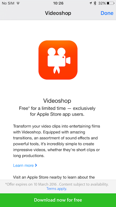 Pokud si tedy budete chtít Videoshop stáhnout zdarma, musíte si nejprve stáhnout aplikaci Apple Store. Tu otevřete a na záložce Účet –> Země vyberete zemi United States (úplně dole) a nahoře kliknete na Uložit. Poté se stačí přepnout na záložku Featured a sjedete dolů, kde uvidíte ikonu aplikace Videoshop. Zde kliknete na Download Videoshop – Video Editor free a poté na Download now for free. Budete přesměrování do App Storu, kde dostanete speciální kód, který když uplatníte, tak si budete moct stáhnout aplikaci Videoshop zcela zdarma. Nabídka platí do 1. dubna, tak ji využijte a editor si stáhněte.