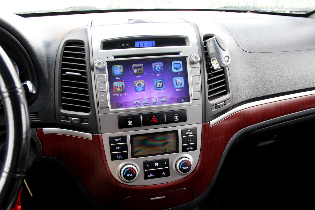 Ze široké nabídky jsme vyzkoušeli 2DINový typ 1202 7“ ve voze Hyundai Santa Fe druhé generace. Na první pohled ani není poznat, že jde o dodatečně namontované rádio, celek totiž vypadá jako z prvovýroby. Jednotlivé modely rádií jsou totiž designově upravené pro konkrétní modely (a to včetně masky), přičemž nabídka zahrnuje většinu u nás prodávaných aut.