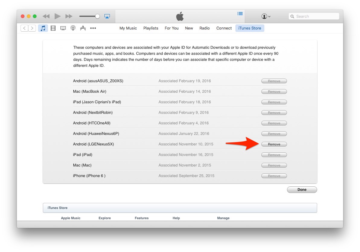 - Objeví se seznam zařízení, které jste autorizovali k používání vašeho iTunes účtu, s tlačítkem Odstranit napravo od názvu zařízení