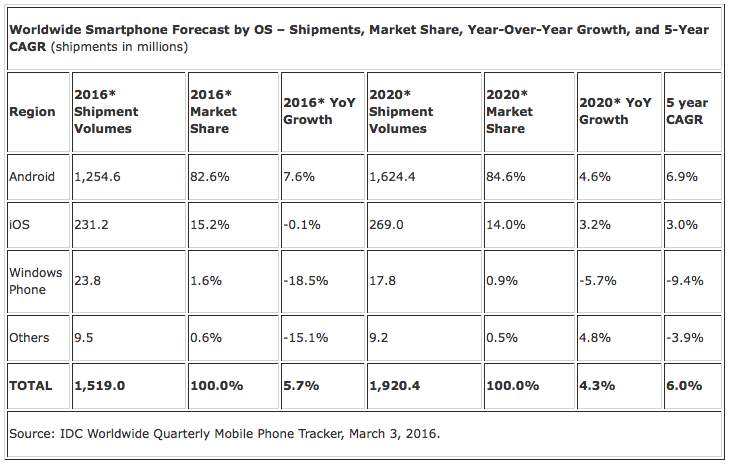 IDC se však domnívá, že budoucí růst iPhonu bude relativně skromný, podle předpovědí okolo 3 % mezi roky 2016 a 2020. Společnost minulý týden oznámila, že počet prodaných Apple Watch dosáhl 4.1 milionů kusů v posledním čtvrtletí roku 2015, což udělalo Apple druhého největšího prodejce wearables za společností Fitbit.