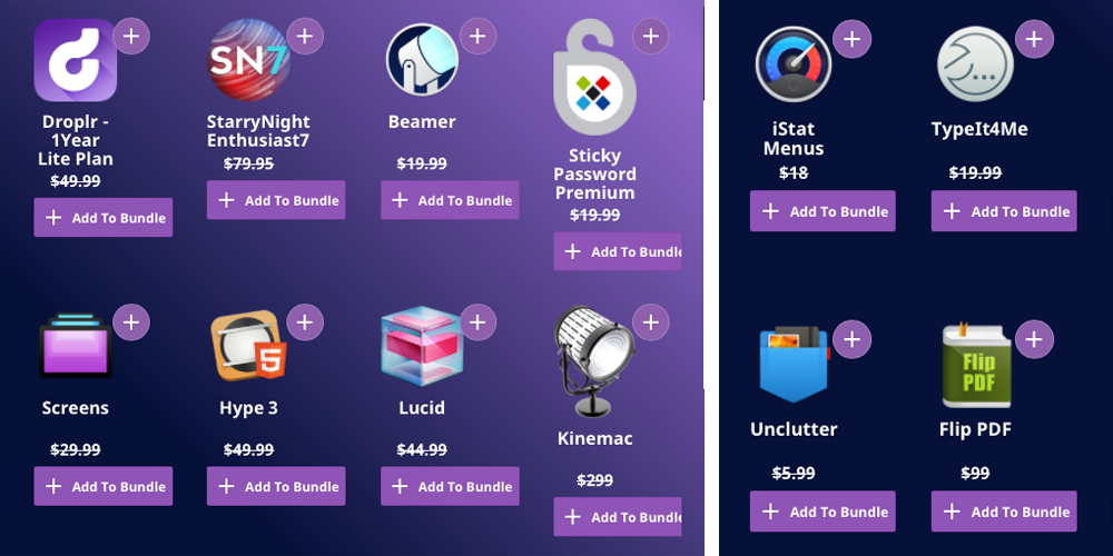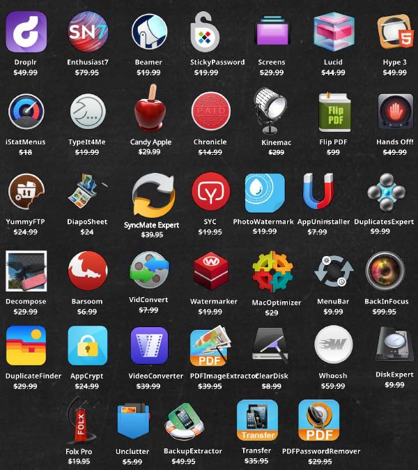 Ja osobne son kupil toto:StarryNight Enthusiast7,Kinemac,iStat Menus ,Softorino YouTube Converter,Duplicate Finder,VideoConverter,iPad iPhone iPod to Mac Transfer,Back In Focus,SyncMate Expert a PDF Password Remover .
