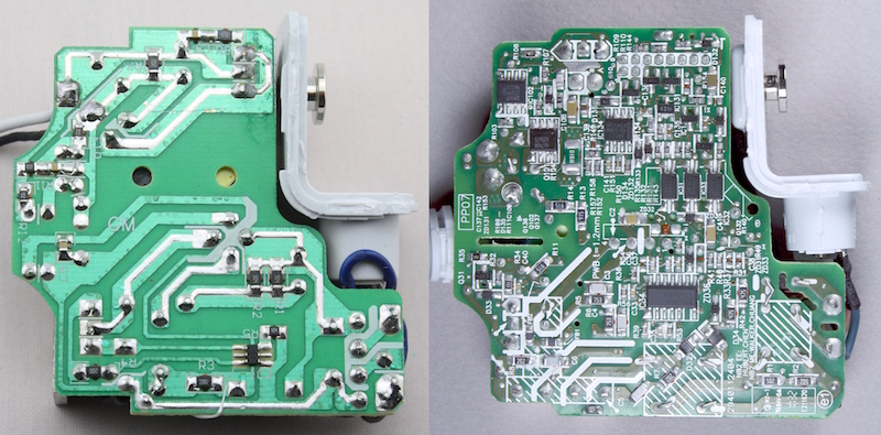 Jak sám Shirrif uvedl, nabíječka nebyla příliš dobře sestavena a rozebrat jí nebyl problém. Po otevření zažil velký šok, jak jsem již psal, na desce oficiálního adaptéru je mnoho součástek a složitých obvodů, kdežto na adaptéru padělaném, byste je hledali marně. Zároveň je adaptér nebezpečný i pro uživatele, protože není téměř vůbec odizolovaný a tudíž hrozí uživateli zásah elektrickým proudem.
