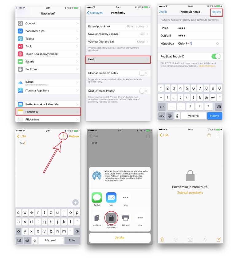 Chcete-li je zaheslovat na iPhonu, iPadu nebo iPodu, musíte mít nejnovější iOS 9.3. Nejprve tedy musíme nastavit heslo. Proto půjdeme do Nastavení -> Poznámky, následně klikneme na možnost Heslo. Zadáme heslo, pod kterými je chceme odemykat. Máte-li zařízení s Touch ID, můžete je odemykat pomocí otisku prstu. Poté již můžeme jít do samotné aplikace. Až napíšeme text, který chceme uzamknout, klikneme na ikonu sdílení a vybereme možnost Zamknout poznámky, a napíšeme námi zvolené heslo. Vedle ikony sdílení se nám zobrazí ikona zámku, klikneme-li na ní, poznámka se uzamkne. Chceme-li poznámku odemknout, klikneme na ikonu sdílení a vybereme možnost Odemknout poznámky.