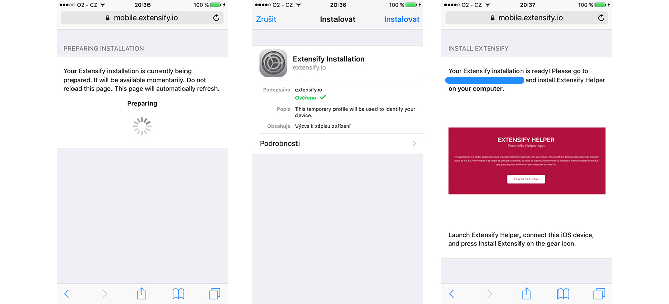 Instalace aplikace je poněkud složitá, ale odměnou bude vylepšený Snapchat , Instagram a další aplikace. Po zadání speciálního kódu na oficiálních stránkách, mohl začít celý proces instalace. Ještě před celým procesem, mě stránka několikrát upozornila, že Extensify je funkční pouze se systémem iOS 9.3. Po vyplnění registračních údajů, jsem na svém iPhonu otevřel stránku, pomocí které jsem nainstaloval Extensify profil. Po nainstalování profilu se automaticky otevřel prohlížeč Safari, který mi sdělil, že mám stáhnout speciální aplikaci Extensify Helper do svého Macu. Poté, co jsem aplikaci na Macu spustil, opět mě aplikace navigovala, jak mám postupovat. Nejprve jsem musel připojit pomocí Lightning kabelu iPhone k Macu, aplikace na Macu zařízení detekovala a spustila celou instalaci která trvala zhruba 3 minuty. Tím byl proces instalace Extensify dokončen. Na první pohled se může zdát instalace poměrně složitá, ale vývojáři vytvořili perfektní návod, který vás krok po kroku provede instalací.
