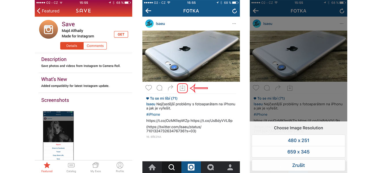 Druhým nejpopulárnějším vylepšením respektive rozšířením je Save. Jak už z názvu vyplývá, Save umožňuje stahovat fotografie z Instagramu pomocí stisknutí jediného tlačítka. Fotografie se poté uloží do galerie v zařízení.