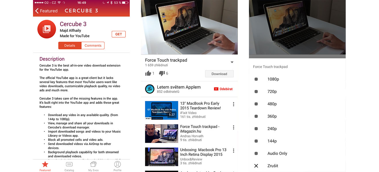 Třetím nejpopulárnějším rozšířením je Cercube 3, jedná se o vylepšenou aplikaci YouTube. Má mnoho vychytávek, jednou z těch nejzajímavějších je stahování videí přímo do galerie iPhonu.