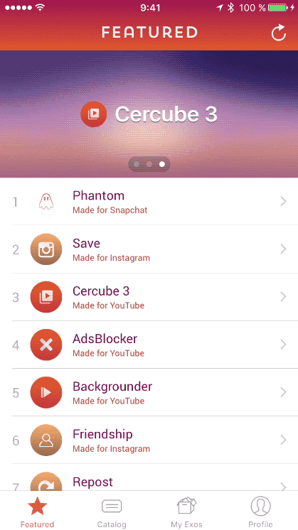 Instalace jednotlivých rozšíření do aplikací je jednoduchá. Poté co jsem vybral Exos, který chci nainstalovat, otevřel se jakýsi profil, podobný tomu, který známe z App Store. Po kliknutí na tlačítko GET se na dolní straně aplikace vysunula nabídka build, která nám vybraný Exos nainstaluje přímo do aplikace. Po kliknutí na zmiňovanou nabídku nám aplikace ještě nabídne možnost nainstalovat více rozšíření do jedné aplikace najednou. Aktuálně nejvíce vylepšení má k dispozici aplikace Instagram a YouTube.
