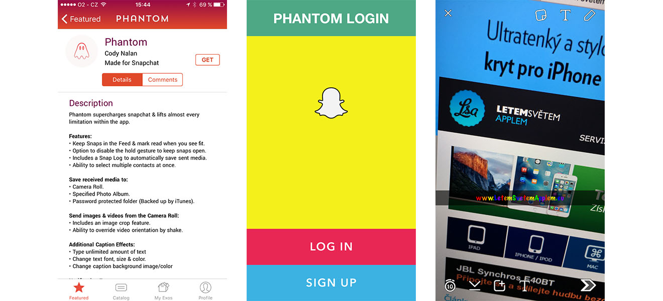 Phantom je aktuálně jeden z nejvíce populárních jailbreak vylepšení a nyní je také nejpopulárnější Exos. Rozšíření Panthom je určené pro Snapchat. Mezi ty nejzásadnější funkce patří například ukládání všech fotografií na které se podíváte, aniž by to druhá strana věděla. Panthom dále dokáže do “snapů” vkládat neomezený počet znaků, měnit více barev textu nebo dokonce přidávat neomezený počet smajlíků. Také šetří přenesená data.
