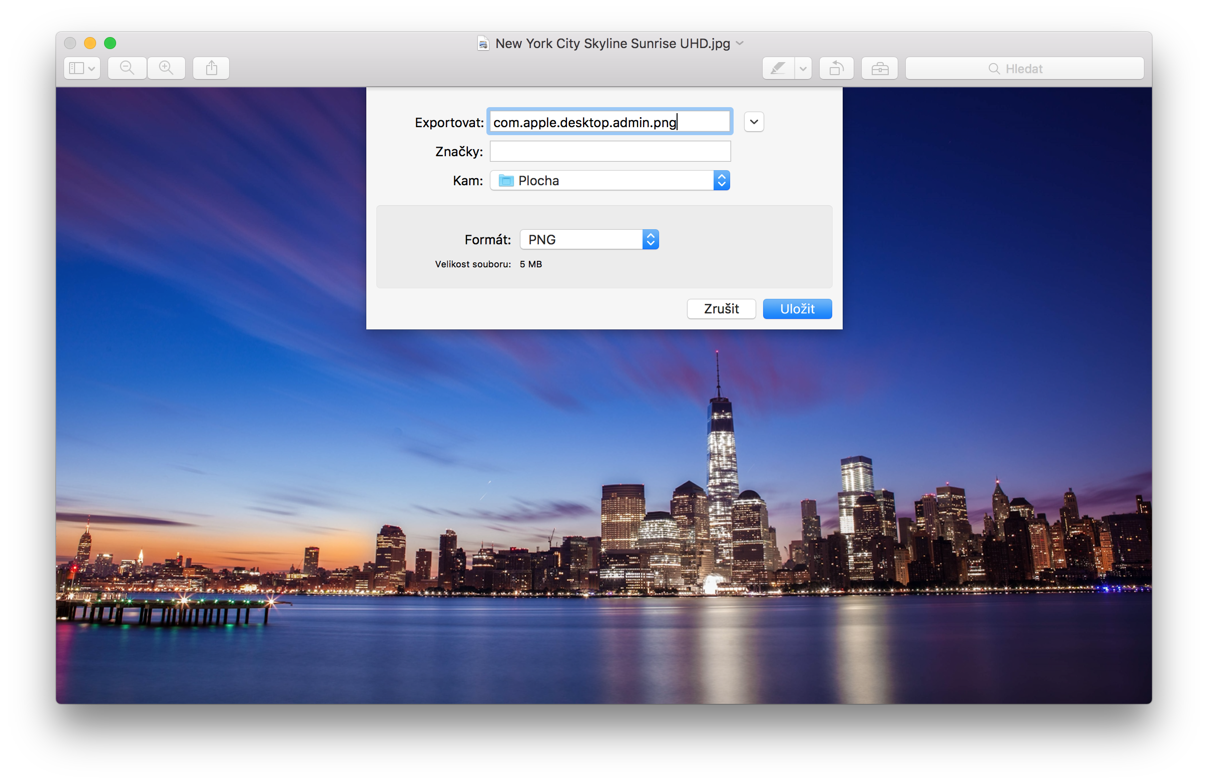 Poté tapetu otevřeme v aplikaci Náhled, v základním nastavení Macu stačí na obrázek jednoduše dvakrát kliknout. Poté půjdeme v manubaru do Soubor -> Exportovat a vybereme příponu PNG. Soubor uložíme na plochu pod názvem „com.apple.desktop.admin.png“