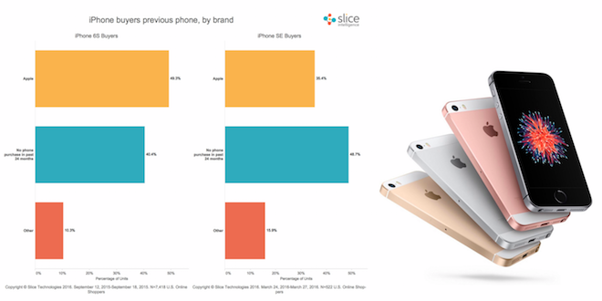 Počáteční data Slice Intelligence ukazují, že iPhone SE by mohl pomoci Applu zvětšit spotřebitelskou základnu uživatelů iPhonu. Pouze 35 % z kupců iPhone SE si koupilo iPhone v posledních 2 letech a 16 % z nich byli dříve uživatelé Androidu. Pro srovnání, 49 % z kupců iPhone 6S, upgradovalo ze staršího iPhonu a 10 % jich nahradilo Android zařízení v posledních 2 letech.