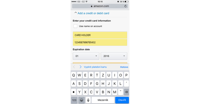 V případě, že budete ve fázi zadání údajů z kreditní karty, tak ve většině případů to Safari pozná. Kliknete-li na kolonku pro zadání čísla, vysune se číselná klávesnice. Na samém horním okraji klávesnice nalezneme možnost Vyplnit platební kartu, na zmiňovanou možnost klikneme a zvolíme další možnost, tentokrát Použít fotoaparát. Pro dosažení nejlepších výsledků, namíříme fotoaparát na kreditní kartu, která by se měla vejít do rámečku, který na displeji svého iPhonu uvidíme. iPhone se bude snažit rozpoznat co nejvíce informací a ty následně vyplnit do požadovaného formuláře. Apple uvádí že iPhone dákže vyplnit jméno držitele karty, číslo karty a datum expirace. Ručně budete muset zadat pouze bezpečnostní kód, který se nachází na zadní straně.
