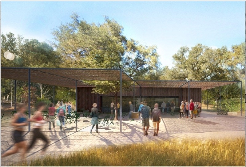 Poslední rendery se týkají venkovního občerstvení. Stavba s jednoduchým designem obsahuje jak klasickou vnitřní kuchyni, tak venkovní snack bar. S možností posezení pod střechou i mimo ní. Budovy venkovního občerstvení budou dvě, a zároveň budou doplňovat ještě hlavní jídelnu, která se bude nacházet uvnitř oválu, a která bude hlavní jídelnou pro celý areál.
