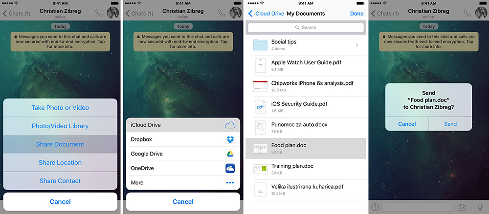 V poslední aktualizaci aplikace WhatsApp již nemusíte své dokumenty nejprve převádět do PDF, ale rovnou je můžete odeslat. Ve své konverzaci tak stačí rozbalit menu, kde následně vyberete Sdílet Dokument, dále vyberete kde máte váš dokument uložený, teď jej najdete, kliknete a dáte Odeslat. Dokumenty vám půjdou určitě odeslat, pokud jste je vytvořili v Microsoft Word, Excel nebo PowerPoint, ale údajně by měly jít všechny typy souborů, které je iOS schopno otevřít.