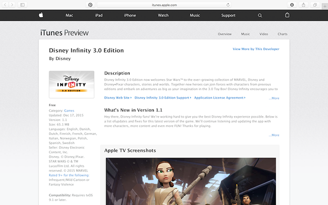 Náhledy aplikací jsou ale prozatím dostupné jen pro pár aplikací, jelikož společnost službu teprve nasazuje a postupně na web přidává jednu aplikaci za druhou. Jak takový náhled aplikace pro Apple TV 4 na webu vypadá, si můžete prohlédnout například na hře Disney Infinity 3.0 nebo Beergeek.com TV. Pozitivní na zprávě je ale hlavně to, že nyní se dočkáme i přehledu slev aplikací pro tvOS, jelikož díky webovým náhledům lze sledovat i ceny a tudíž i případné slevy.
