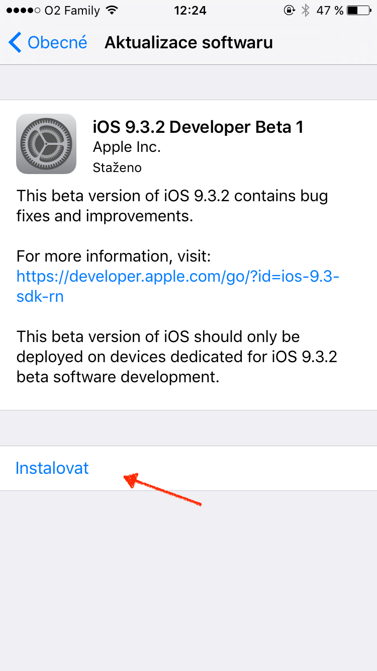 1. Navštivte Nastavení –> Obecné –> Aktualizace softwaru a zkontrolujte, jestli máte u nabízené aktualizace jen Instalovat (neklikejte na něj)