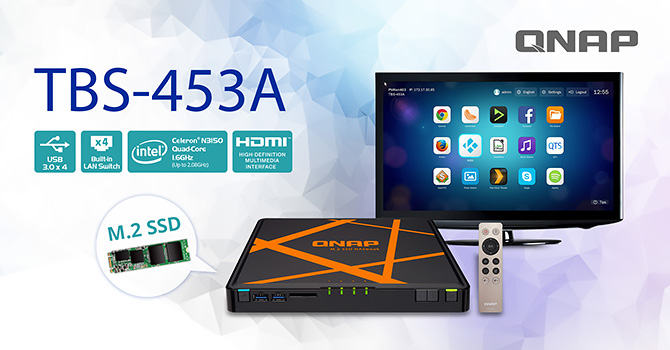 QNAP představil první světový NAS založený na M.2 SSD: TBS-453A NASbook. TBS-453A, který je vybaven čtyřjádrovým procesorem Intel® a k ukládání dat využívá M.2 SSD, nejenže poskytuje plnou funkcionalitu NAS s ochranou RAID v ultra-kompaktní podobě, ale umí fungovat také jako fyzický síťový switch a sdílet přístup k síti s více uživateli. Díky své kompaktní téměř neslyšné konstrukci, duálnímu výstupnímu rozhraní HDMI s podporou až 4K rozlišení se TBS-453A NASbook vejde kamkoli a může tak posílit produktivitu a konektivitu malých kanceláří.