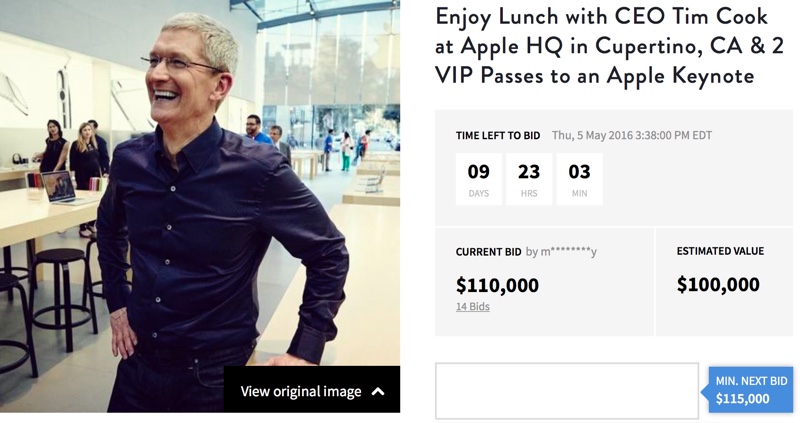 Nevíte co s penězi, máte rádi Apple, rádi přispíváte na charitativní události a nepohrdnete dobrým jídlem? Máme pro vás řešení! Již čtvrtý rok po sobě, můžete vydražit v charitativní akci oběd s ředitelem Apple, Timem Cookem. Zájemce, který nabídne nejvyšší částku, čeká polední seance přímo v centrále Apple v Cupertinu. Jako malý (nebo velký?) bonus dostane „výherce“ vstupenky na blíže nespecifikovaný Apple event (nejpravděpodobněji zářijové Apple Keynote). Celkový výtěžek za všechny „charitativní obědy“ již hravě překonal milion dolarů.