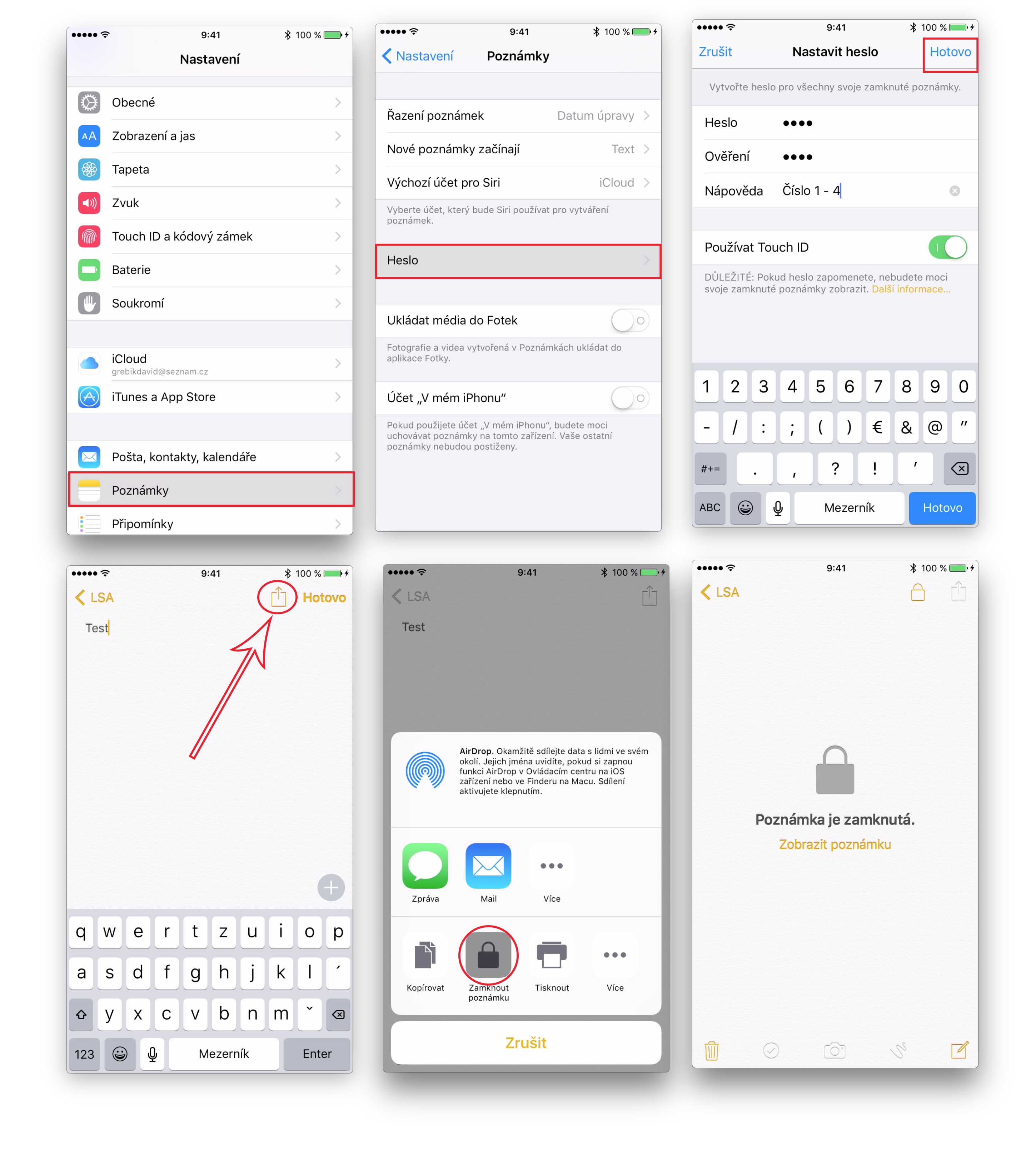 V iOS 9.3 můžeme veškeré poznámky jednoduše zaheslovat. Chcete-li je zaheslovat na iPhonu, iPadu nebo iPodu, musíte mít nejnovější iOS 9.3. Nejprve tedy musíme nastavit heslo. Proto půjdeme do Nastavení -> Poznámky, následně klikneme na možnost Heslo. Zadáme heslo, pod kterými je chceme odemykat. Máte-li zařízení s Touch ID, můžete je odemykat pomocí otisku prstu. Poté již můžeme jít do samotné aplikace. Až napíšeme text, který chceme uzamknout, klikneme na ikonu sdílení a vybereme možnost Zamknout poznámky, a napíšeme námi zvolené heslo. Vedle ikony sdílení se nám zobrazí ikona zámku, klikneme-li na ní, poznámka se uzamkne. Chceme-li poznámku odemknout, klikneme na ikonu sdílení a vybereme možnost Odemknout poznámky.