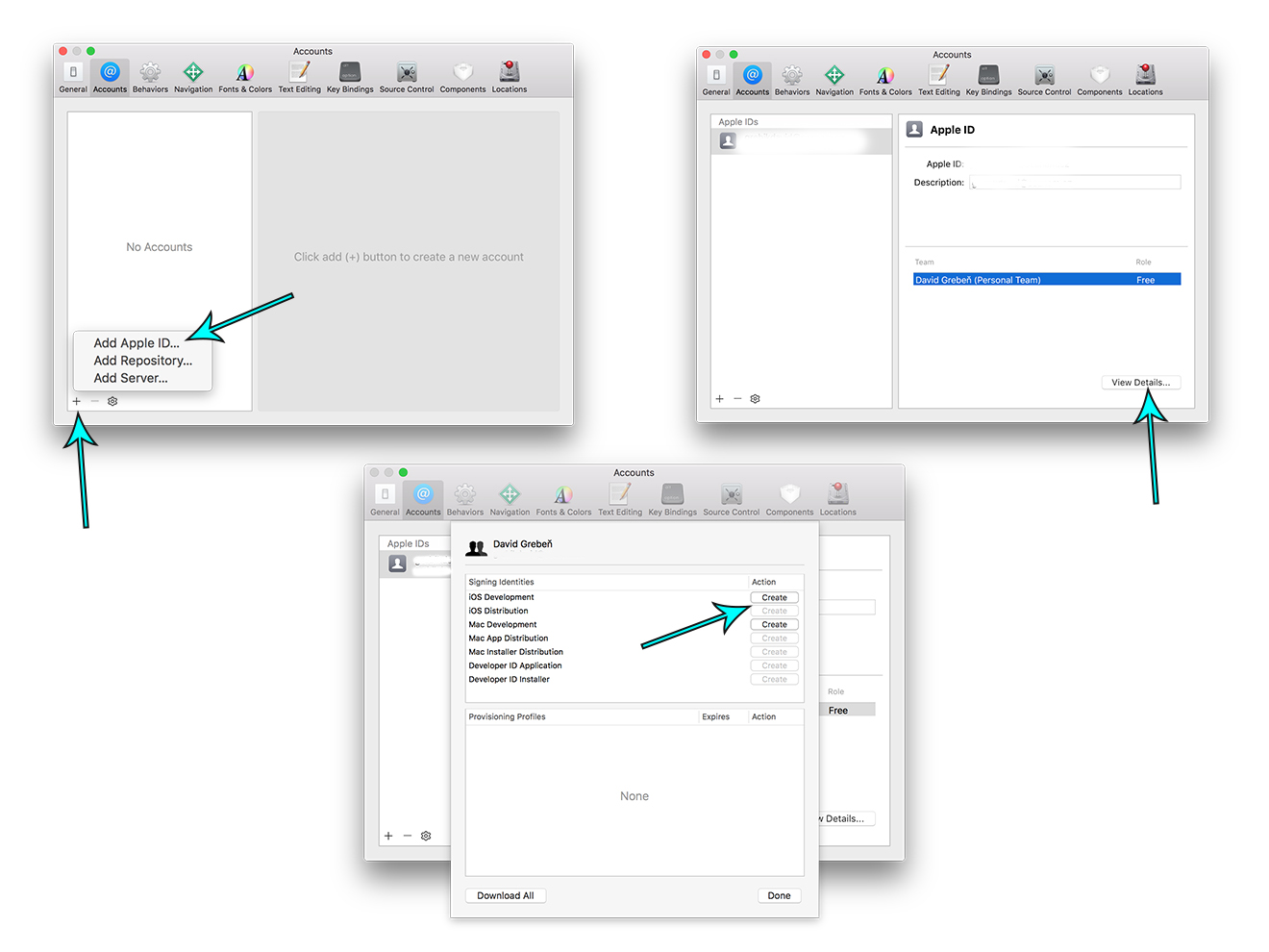 Nejrpve musíme stáhnout program Xcode z Mac App Storu. Po stažení zhruba 5 GB dat, se aplikace nainstaluje a my připojíme iPhone k Macu pomocí Lightning kabelu. Otevřeme Xcode a v menubaru klikneme na Xcode -> Preferences, kde vybereme záložku Account. V levém horním rohu klikneme na „+“ a zvolíme možnost Add Apple ID. Po přihlášení klikneme na View Details a klikneme na Create u položky iOS Development. Pokud tam možnost Create nemáte, nic se neděje.