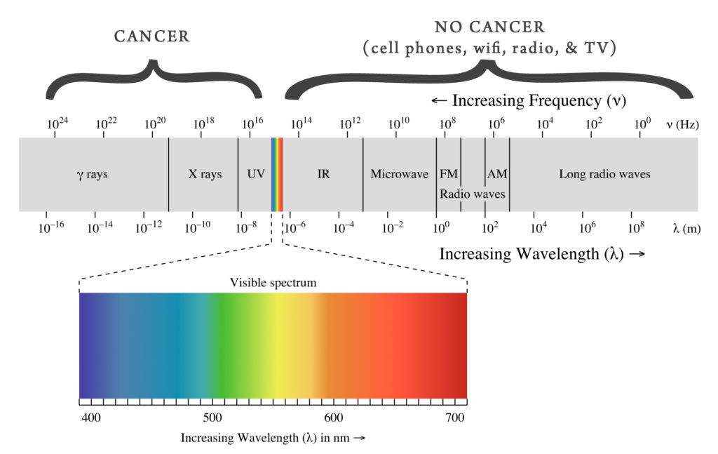 Výskyt rakoviny mozku zaznamenal nepatrné vzrůstající tendence u mužů, a o něco vyšší u žen, už v průběhu 70 let, ale v té době žádné mobilní telefony neexistovali, proto zde není žádná korelace mezi používáním mobilního telefonu a výskytu rakoviny mozku. Telefonní zařízení emitují neionizujicí záření, které jim umožňuje spojení se signálními centry a vysílači. Na obrázku níže pak vidíte, že toto záření se nachází vpravo od viditelného spektra, tudíž v oblasti neškodných typů záření (na rozdíl od UV záření, rentgenového záření a gama záření). Pokud se tedy bojíte, že vám telefon způsobí rakovinu mozku, nemusíte. To už je pravděpodobnější, že vám telefon při používání exploduje v ruce.