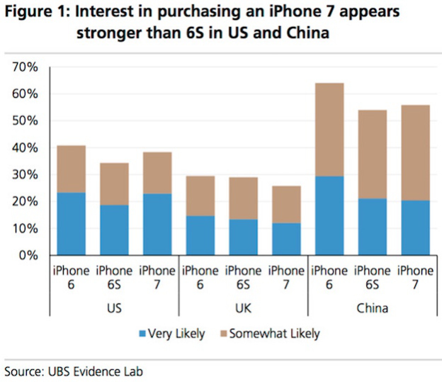 USB Evidence Lab přišla s průzkumem úrovní zájmu o nový iPhone 7 na trzích v Číně, USA a Velké Británii. V Americe a Číně je zájem o nový model vyšší, než byl zájem o 6s před zahájením prodejů. Ve Velké Británii je to naopak. Je nutno ovšem podotknout, že téměř 50% dotazovaných uvedlo, že si počkají na rozhodnutí až do doby, než nový model skutečně vyjde.