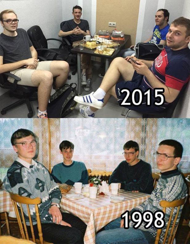 Pokud už několik let závislácky projíždíte zeď na Facebooku nebo jiná, temnější zákoutí internetu, pak jste jistě narazili na fotografii čtyř mladíků, údajných studentů IT z roku 1998. Mladíci se slušivými brýlemi a „devadesátkovými“ svetry, se stali symbolem pořádné „ajťácké“ párty. Nyní se celá partička po 17 letech sešla u podobného stolu.
