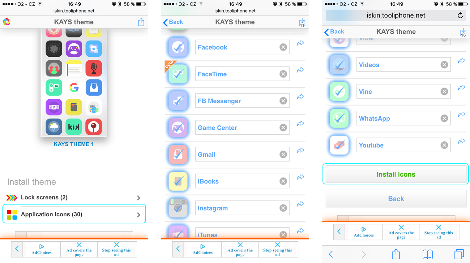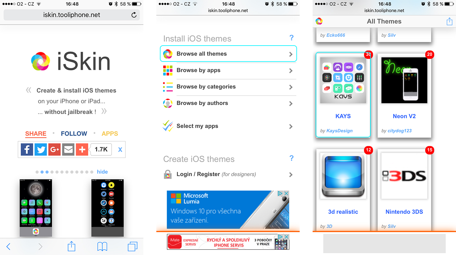 Nejprve budeme muset navštívit webovou stránku iskin.tooliphone.net v prohlížeči Safari na iOS zařízení. Poté co se stránka načte sjedeme dolů a zvolíme možnost Browse all themes a následně vybereme motiv, který se nám bude líbit (my jsme konkrétně zvolili motiv KAYS).