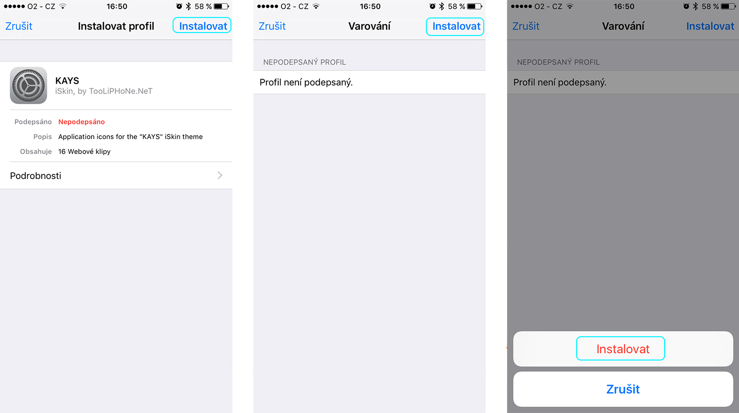 Poté se nám otevře okno instalace profilu, který musíme pro správné fungování nainstalovat. Klikneme tedy v pravém horním rohu na možnost Instalovat. Následně budeme muset zadat číselný kód k telefonu. Po zadání kódu nás iPhone upozorní, že profil není podepsaný, což rozhodně není žádný problém a klikneme znovu vpravo na možnost Instalovat. Ještě jednou se nás iPhone zeptá, zda-li opravdu chceme profil (motiv) nainstalovat, klikneme tedy na Instalovat. Zobrazí po dokončení se zobrazí okno Safari, ve kterém počkáme do té doby, než zhasne kolečko s nápisem Please WAIT ! Pokud kolečko nezhasne, stačí počkat přibližně jednu minutu a Safari zavřít.