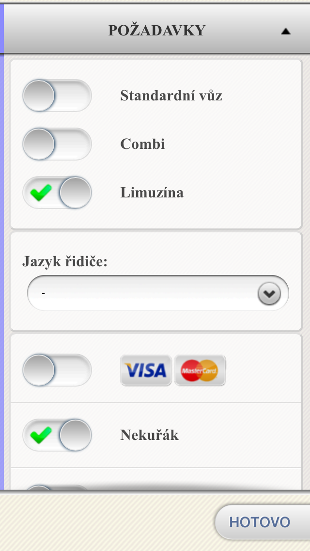 Před potvrzením objednávky si můžete spočítat orientační cenu i čas jízdy a zároveň zvolit svoje požadavky na vůz. Můžete si vybrat např. limuzínu, combi, nekuřácký vůz, vůz pro přepravu psa nebo zvolit požadavek na jazykové znalosti řidiče. Taxi si můžete aplikací objednat okamžitě, nebo na pozdější dobu ve formě předobjednávky na konkrétní čas. Po nástupu do vozu lze v aplikaci spustit virtuální taxametr, který vám pohlídá cenu jízdy.