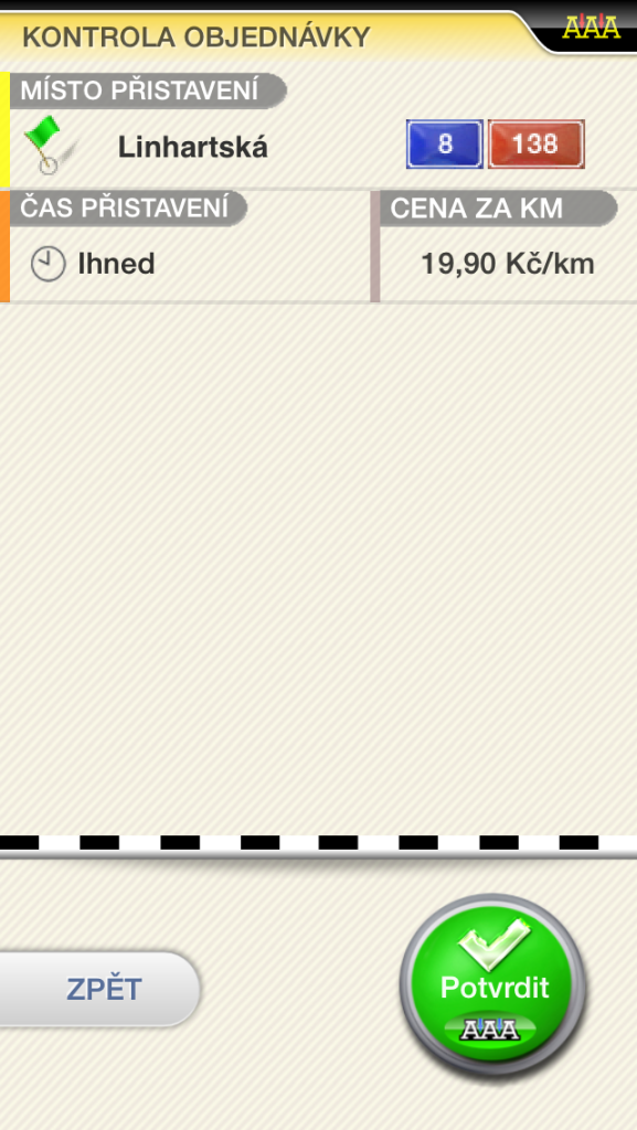 Téměř každý již musel někdy řešit situaci, kdy se v metropoli potřeboval rychle a spolehlivě dopravit na požadované místo. Ideálním řešením je taxi. Je přitom zbytečné znát a ukládat si telefonní čísla, nebo si pamatovat stanoviště. Zdarma dostupná mobilní aplikace AAA Taxi pro operační systém iOS se může stát vaším užitečným pomocníkem na cestách po Praze.