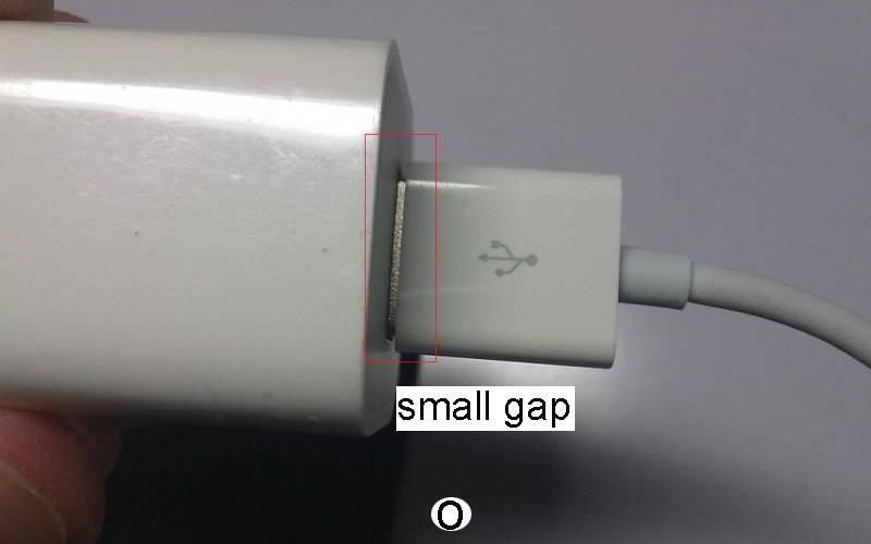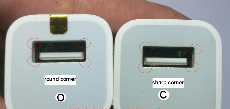 - Originální 5W adaptér k iPhonu, má okolo USB zdířky zaoblené rohy, zatímco ve většině případů má padělaný adaptér rohy hranaté. Ačkoliv adaptér na obrázku níže není určen pro naše zásuvky, stejné chyby dělají i padělatelé EU adaptérů. (C – Padělek, O – Original)