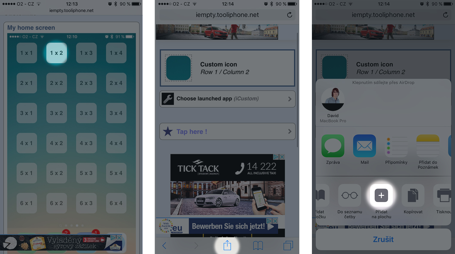 Zobrazí se nám screen s „ikonami“. Pokud budeme chtít udělat mezeru mezi 1×1 a 1×3, tak pochopitelně klikneme na 1×2. Po vybrání klikneme na ikonu sdílení a vybereme ve spodním řádku možnost Přidat na plochu. V pravém horním rohu klikneme na volbu Přidat.