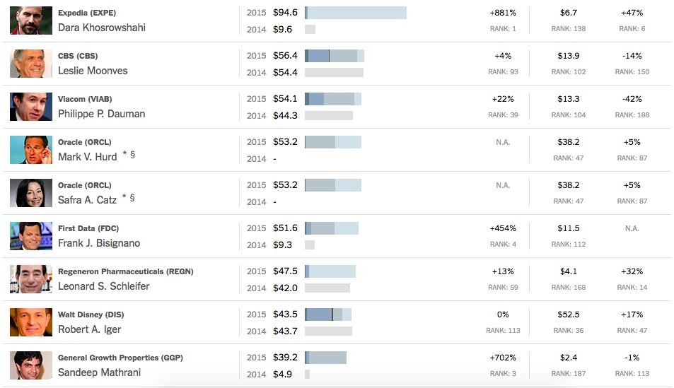 Studie zjistila, že poprvé od roku 2011 nikdo z Amerických ředitelů nevydělal více než 100 milionů dolarů, přičemž nejvyšší plat (94,6 milionů dolarů) dostal Dara Khosrowshihi, který stojí za společností Expedia. V roce 2014 vydělal ale „pouze“ 9,6 milionu dolarů. Na druhém místě skončil CEO společnosti CBS – Leslie Moonves, který vydělal přibližně o 40 milionů dolarů méně.