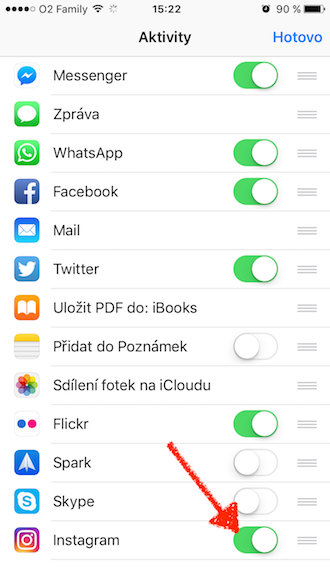 Abyste ale mohli sdílet fotografie na Instagram odkudkoli z iPhonu, je nutné si rozšíření aktivovat. Stačí tedy otevřít aplikaci Fotky, zvolit nějakou fotografii, vlevo dole kliknout na ikonu pro sdílení, v prostředním řádku dojet až na úplný konec, zvolit Více a zde úplně dole zaškrtnout Instagram případně si jej můžete posunout nahoru. Nyní už jen stačí nahoře kliknout na Hotovo a ikona Instagramu se vám ukáže mezi ostatními ikonami aplikací.