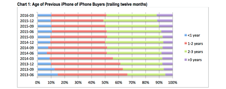 Podle nejnovějších průzkumů CIRP (Consumer Intelligence Research Partners) se ukázalo, že vlastníci iPhonů si ho obměňují jednou za dva roky. Po průzkumu před třemi roky jej přitom dvě třetiny uživatelů měnily zhruba za 1 a půl roku. Za poslední tři roky tedy klesl zájem o nové iPhony na 51%. Cirp připisuje tuto změnu hlavně zpomalení a financování telefonů ze strany operátorů. Jen před několika roky operátoři vyzívali zákazníky využít dvouletý cyklus upgradování telefonu, při kterém zákazníci dostali slevu na nově zakoupený model. V dnešní době ale operátoři nutí platit zákazníky nové telefony v plné výši, přičemž jim dávají bonusy, které ale nejsou ani zdaleka takové, aby donutily zákazníky nový telefon kupovat.