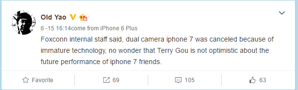 iPhone 7 by měl být představen už na podzim tohoto roku. Už dříve analytici říkali, že příští generace iPhonu nebude mít 3,5mm jack konektor, bude mít přepracované antény, ale také už od ledna se objevují informace, že by měl mít větší iPhone 7 Plus také duální fotoaparát. Nyní nejmenovaný pracovník Foxconnu řekl, že iPhone 7 Plus se nakonec duálního fotoaparátu nedočká, a to z důvodu „nedokončené technologie“, přesto nikdo nepotvrdil, ale ani nevyvrátil pravdivost informace. Duální fotoaparát u iPhonu 7 Plus měla být největší novinka velkého telefonu, který bude mít na zádech logo nakousnutého jablíčka.