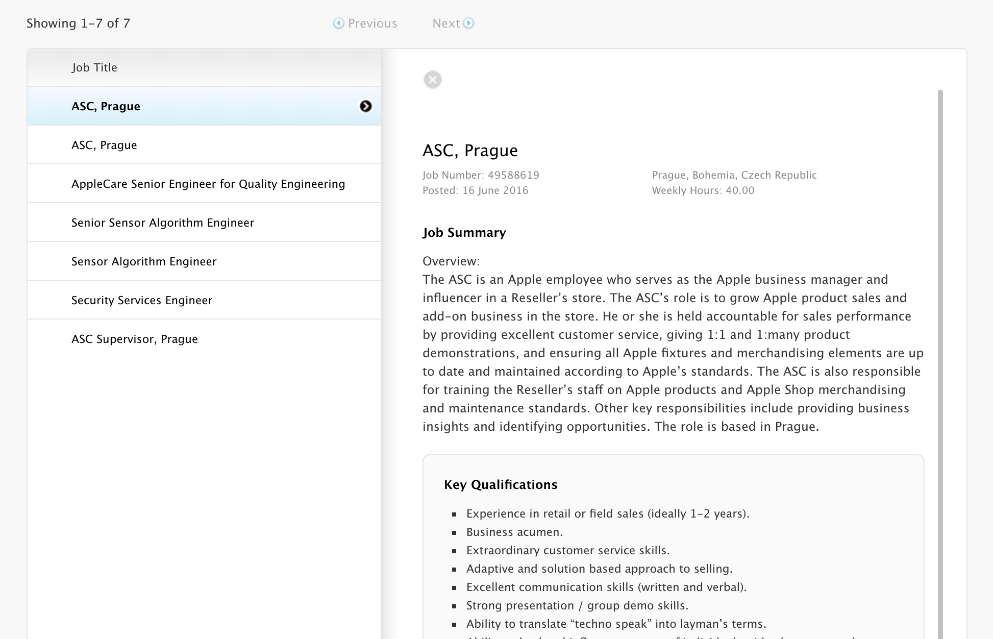 Jak již bylo zmíněno, tak největší požadavky jsou kladeny na pozici obchodníka, tedy konkrétně ASC obchodníka, který musí mít alespoň jeden až dva roky zkušeností s maloobchodním prodejem v na mezinárodní úrovni. Pokud se chcete podívat a nebo máte zájem o některou z pracovních pozic Applu, tak se můžete o práci informovat na oficiálních stránkách Applu.