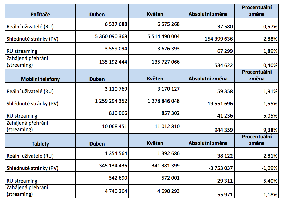 V květnu se zvýšil počet uživatelů, kteří sledovali streamovaný obsah na mobilních zařízeních. Pětiprocentní nárůst byl zaznamenán jak na mobilních telefonech (572 tisíc RU v květnu), tak na tabletech (857 tisíc RU). Počet uživatelů, sledujících online videa na klasických počítačích se zvýšil o necelá dvě procenta. Data přináší nejnovější výsledky NetMonitoru.